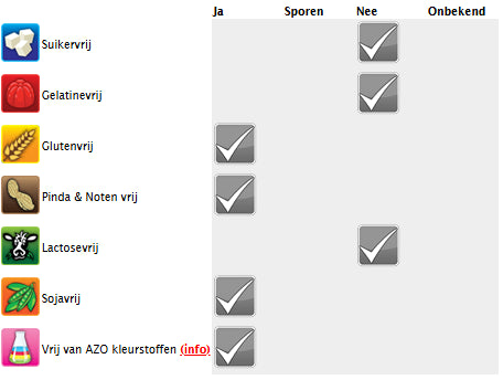 Zutaten: Glukosesirup, Zucker, Magermilchpulver (6%), Gelatine, Säuerungsmittel (Citronensäure, Milchsäure), Geliermittel (Pektin), Aromen, färbende Lebensmittel (Holunderbeere, Schwarze Johannisbeere, Schwarze Karotte, Kurkuma, Zitrone, Saflor, Karamellzuckersirup), Palmöl, Überzugsmittel (weißes und gelbes Bienenwachs, Carnaubawachs).